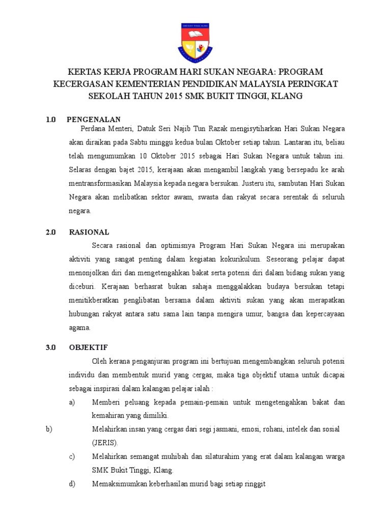 Sambutan Hari Sukan Negara ini merupakan suatu inisiatif Kementerian Belia dan Sukan di mana ia adalah satu langkah pro aktif didalam proses transformasi ke arah mencapai hasrat menjadikan Malaysia sebagai. Kertas kerja lengkap dengan aturcara peranan jawatankuasa dan struktur organisasi. Full PDF Package Download Full PDF Package.
