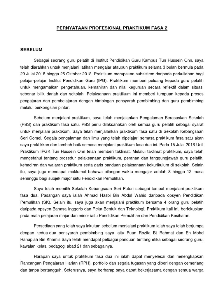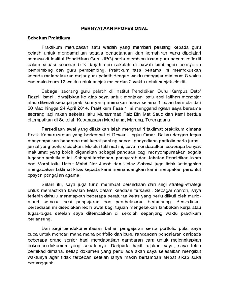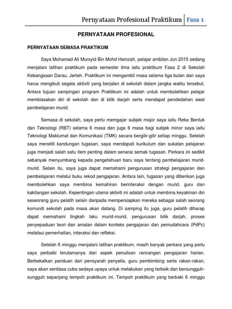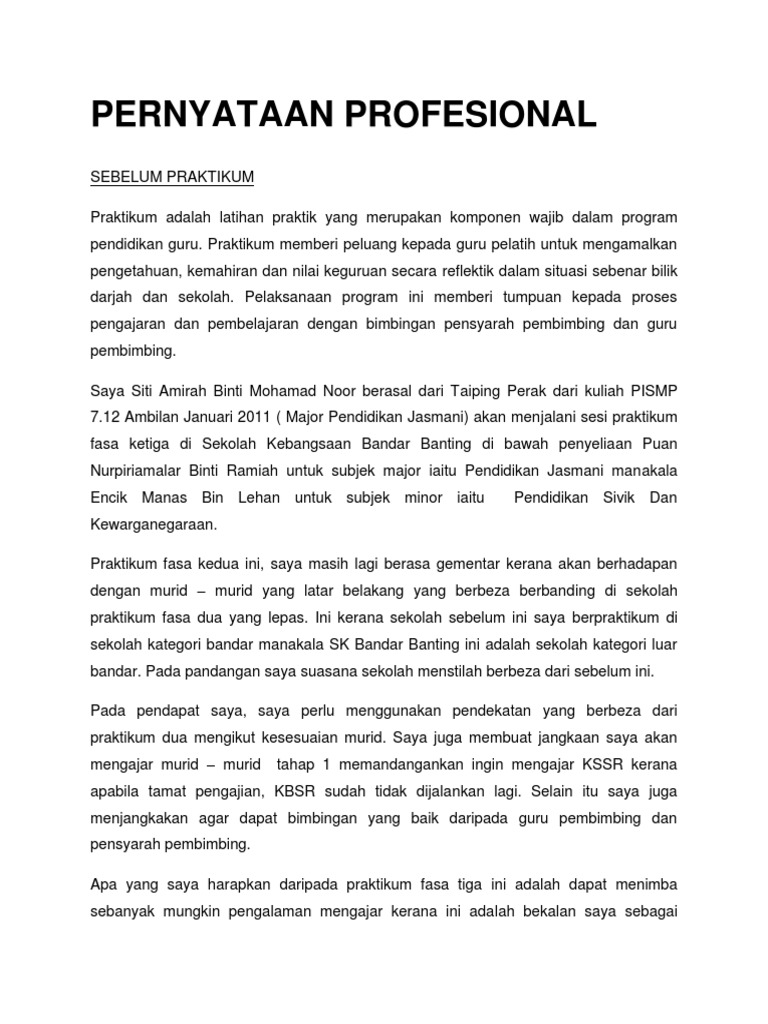 PERNYATAAN PROFESIONAL a Apa Yang Akan Dilaksanakan Semasa Praktikum. Doc penyataan profesional full hazwani yusof academia edu. Fokus utama praktikum pada fasa 1 ini ialah melaksanakan pengajaran di sekolah bagi subjek major iaitu bahasa melayu.