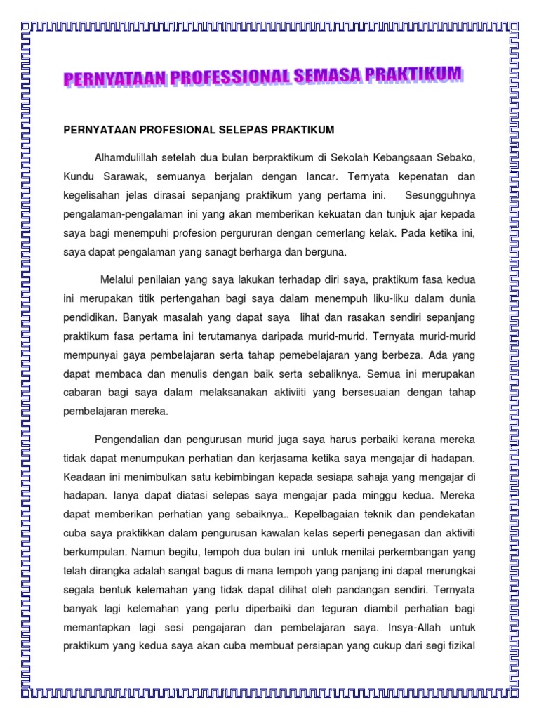 Home Unlabelled Pernyataan Profesional Praktikum Fasa 1 - mond niel Talk Contoh format laporan praktikum. Hardeli msi ananda putra msi phd dr. PERNYATAAN PROFESIONAL PERNYATAAN PROFESIONAL SEBELUM Perasaan saya sebelum menempatkan di Sekolah Kebangsaan Jalan Gurney 1 ialah saya berasa sungguh teruja.