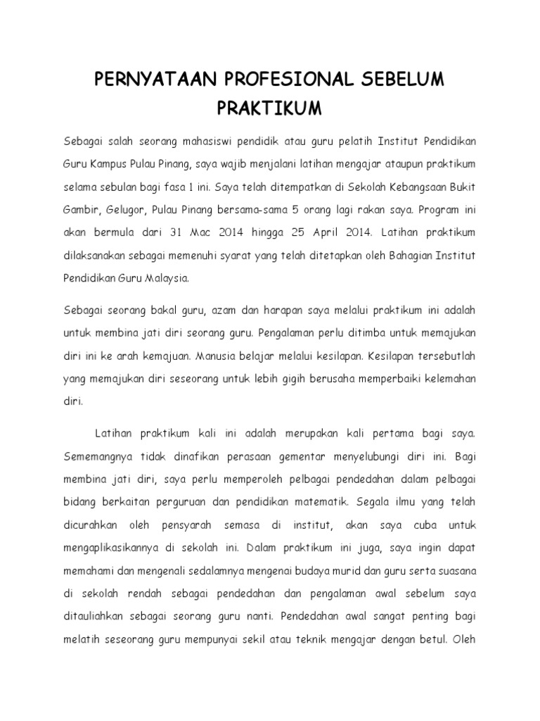 Praktikum bagi kami yang mengambil opsyen TESL akan. Academiaedu is a platform for academics to share research papers. Pernyataan Profesional Praktikum Fasa 1.